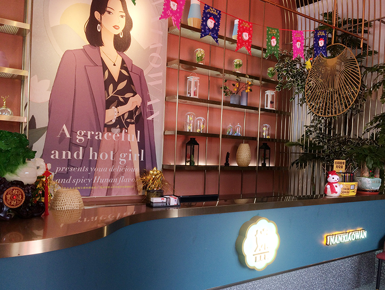 品類可以雷同,但品牌都有自己的特性。品深餐飲策劃設計在2018年服務一家湘菜餐廳-南小婉。我們一開始就圍繞著南小婉這種偏女性的特點,把品牌具象成大家極為熟悉的湖南妹子,突破了傳統湘菜那種鄉村、原始、自然、大紅,刻意土里土氣的大眾風格,整個格調更加精致,輕奢,藝術氣息,再匹配詳細的平面形象、物料應用設計,整個空間個性特色,成了深圳湘菜餐廳中顏值高,生意好的代表性品牌。