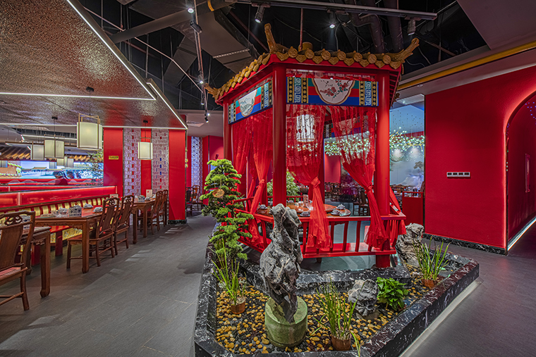 京味張的空間裝飾設計大量借鑒了中式園林造景手法,一步一小景、三步一大景,步移景異。用中國紅強化品牌內含的北京皇城文化,令人印象鮮明;門口的迎賓人,提籠遛鳥人,跑堂人等雕塑銅人將老北京烤鴨飲食文化自然帶出;中式園林造景手法,點綴綠植,水景,框景,步移景異;天花的不銹鋼波紋板,一朵朵的祥云裝飾;矮隔斷的千里江山中國山水工筆畫造型裝飾,仿佛流動的山水國畫;立面的水晶玻璃磚,暗藏燈帶的玻璃隔斷,空間中各種不銹鋼收邊條,明檔上的不銹鋼背發光字,現代裝飾材料與經典美食交相輝映,經典不失時尚。