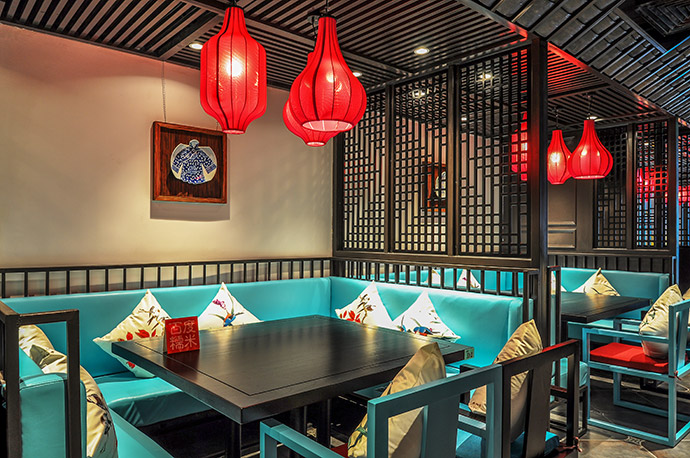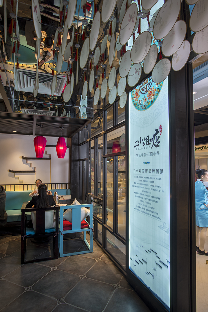 有了識別度高的平面形象,我們更要有強烈的有鮮明的主題風格,或清新、或時尚歡快的空間裝飾,所以在空間設計上,我們充分依托中式風和蘇繡元素。