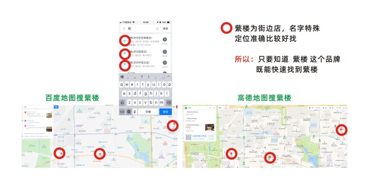 蘩樓”這個詞在搜索端屬于新詞,且由于都是臨街店鋪,只要在導(dǎo)航地圖上搜索“蘩樓”即可出現(xiàn)店面的準(zhǔn)確地址,因此在海報地址信息中只需要告訴顧客店址區(qū)域即可,如:“華強北店”顧客自動腦補深圳華強北區(qū)域蘩樓,加上智能手機強大的導(dǎo)航功能,只需要搜索“蘩樓”選取“華強北”為主的關(guān)鍵詞即可知道離店的大概距離。