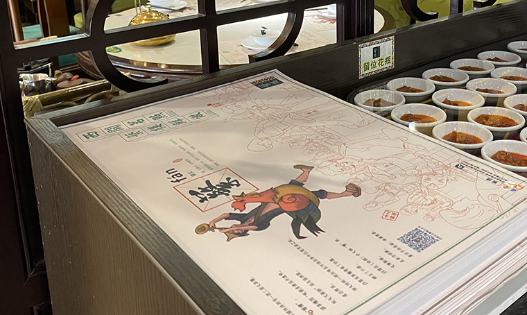 此次海報設(shè)計有六個連續(xù)畫面,正好適合推廣明星款產(chǎn)品。因蘩樓的產(chǎn)品本身就有較強的藝術(shù)美感及傳頌效果,綜合店長及蘩樓主廚師建議,我們選取了6款產(chǎn)品來作為本次海報主題畫面,每一款海報主推一款明星產(chǎn)品,以連續(xù)陣列式畫面排開,顧客路過通過6個重復(fù)品牌畫面+強調(diào)明星產(chǎn)品的形式,視覺震撼,很容易形成對蘩樓的品牌記憶。