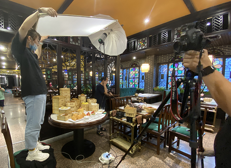 為達(dá)到理想拍攝效果,品深設(shè)計師再次來到蘩樓與廚師交流,了解這十款產(chǎn)品的特色,用料,制作工藝等細(xì)節(jié),同時也購買有關(guān)廣式點心制作相關(guān)書籍進(jìn)行對比學(xué)習(xí),獲得很多新發(fā)現(xiàn),如:判斷手工炸油條好壞,必須要展示其“