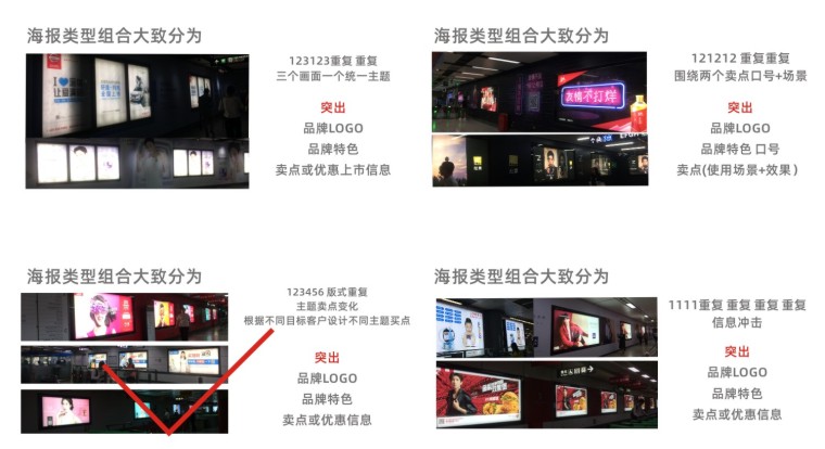 我們選取了(周末時間+上班時間)兩天,對深圳客流密集的多個地鐵中轉(zhuǎn)站點,和幾個特定時間段。進(jìn)行現(xiàn)場蹲點觀察,并拍攝了目前1000多張地鐵站現(xiàn)存的海報圖片實例。通過對海報圖片的分類整理,地鐵站客流對廣告關(guān)注度點的觀察。最終團隊投票選取出印象最深且能傳達(dá)品牌信息的多張地鐵站品牌海報進(jìn)行廣告?zhèn)鞑ピ砑霸O(shè)計原理逆向推理分析: