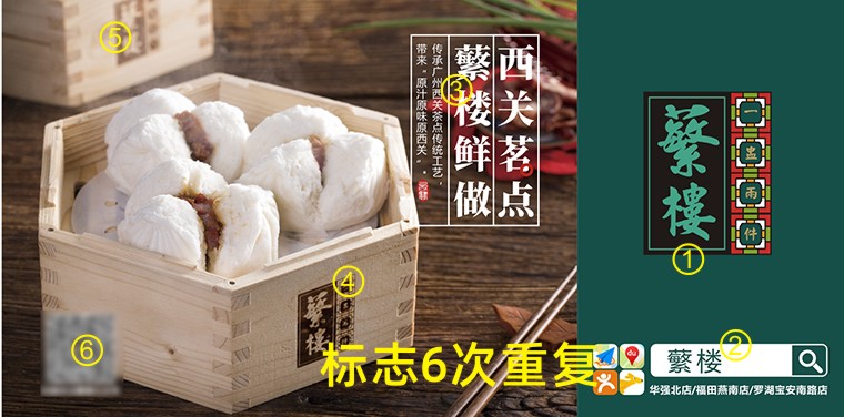 a 畫面重復(fù)三次以上出現(xiàn)“蘩樓”logo信息:由于顧客是路過,而且離畫面很近,所以眼光掃射之處并不是全部看見海報的,而是海報的某一個角落或一個點一個面的形式組合。因此畫面中我們從廣告語“西關(guān)茗點,蘩樓鮮做”+蘩樓logo+搜索框“蘩樓”+蒸籠上“蘩樓”,在一個畫面中多次刻意出現(xiàn)蘩樓品牌logo。