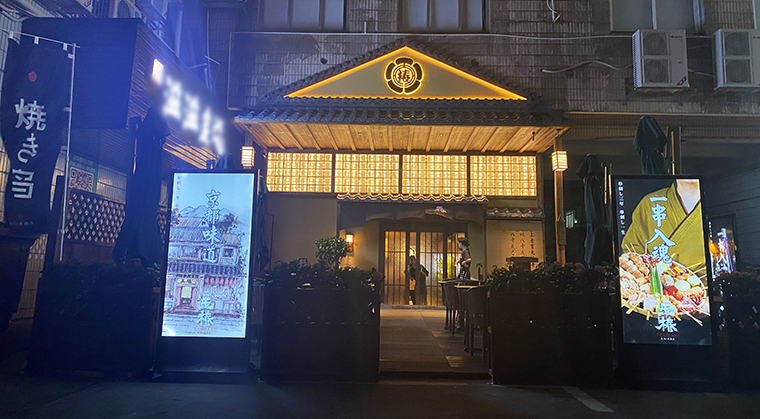 比如玉椿燒鳥居酒屋的門頭,使用京都古建筑的山墻造型,中間裝飾“椿”的家徽,既表達品牌名稱,又有強烈的復(fù)古氣質(zhì),極具日本江戶時代特征。中間一排玻璃磚是整個門頭的點睛之筆,方形玻璃磚,厚度達到50MM,燈光照射下有一種晶瑩剔透的視覺感受,現(xiàn)代時尚氣息濃厚。方形玻璃磚與門頭的復(fù)古氣質(zhì)形成強烈對比。古典與現(xiàn)代碰撞,迸發(fā)出耀眼的視覺火花,消費者的眼光一下子就被吸引過來,并且迅速產(chǎn)生了一種迫切想進店的消費沖動。這就是借助造型藝術(shù)體現(xiàn)品牌屬性,靈活使用裝飾材質(zhì)的特性,實現(xiàn)了古典與現(xiàn)代的交融。
