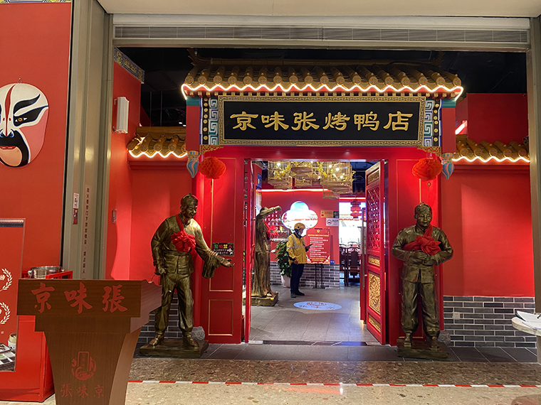 品深設(shè)計全案升級的京味張烤鴨店,是北京菜的代表品牌,整個門面采用大面積中國紅,非常鮮明,醒目。消費者可以用一句話就表達出來:整個門面全部是紅色那個餐廳。這就很好被消費者傳播了。色彩色調(diào)搭配在門面設(shè)計、門頭設(shè)計中需要重點考慮,合理搭配。