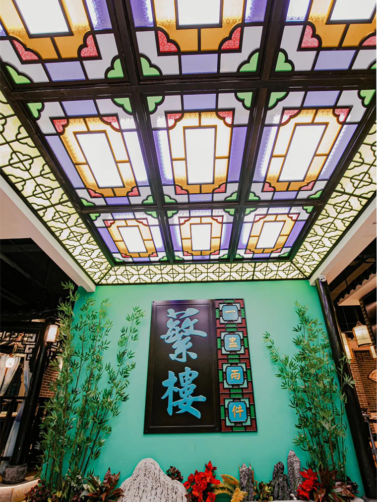 ,通過“紅配綠,大紅配大綠”這種大膽的色彩運(yùn)用,將“得閑飲茶”的廣式休閑飲食生活文化營造的非常鮮明,時(shí)尚又極富歷史厚重感,深受廣大顧客的喜愛,為門店創(chuàng)造了持續(xù)穩(wěn)定的客流。