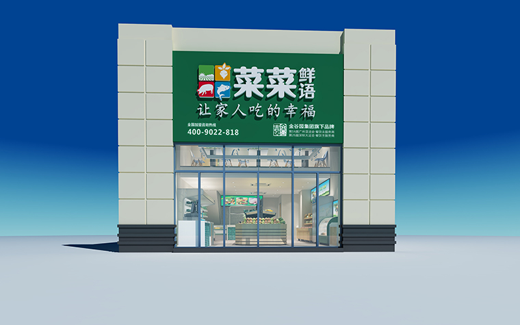 本次品深餐飲設計策劃服務的生鮮連鎖品牌為全案策劃設計服務??臻g裝飾裝修設計的目的一是為了通過合理的空間功能規劃,使空間動線合理流暢,顧客多的時候也井然有序,運營效率高;二是為了傳達菜菜公社品牌高品質社區生鮮產品的定位,讓顧客有一種直觀的認知。