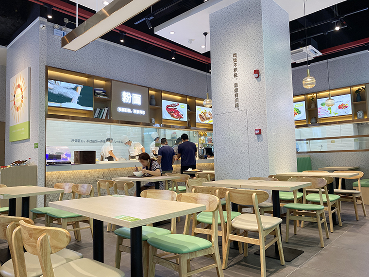 匯鈺二食堂在空間大面積使用水磨石飾面板,整體明亮清新,自然,富有文藝氣息,完美實現(xiàn)了消費者對更高品質(zhì)、更純味道、更好生活的要求。