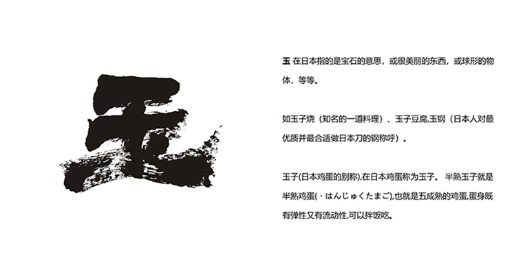 “”在日本指的是寶石的意思,或很美麗的東西,或球形的物體等等。如玉子(日本雞蛋的別稱),半熟玉子就是半熟雞蛋(はんじゅくたまご),也就是五成熟的雞蛋,蛋身既有彈性又有流動性,可以拌飯吃。玉子燒(知名的一道料理),玉子豆腐,玉鋼(日本人對最優質并最合適做日本刀的鋼的美稱)。